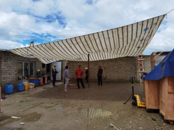 簡單休息后,試驗組立即投入到試驗的各項準(zhǔn)備工作中,拆箱、產(chǎn)品狀態(tài)檢查、設(shè)備定位......可沒干多久就被第一只“高原虎”——突如其來且聲勢壯大的雨水打斷,試驗組趕緊為電氣設(shè)備蓋上防雨布。無奈天公不作美,近段時間有連續(xù)較強降雨,經(jīng)過再三討論,大家決定利用戶外地形臨時搭建簡易防雨棚,試驗組只能和雨水賽跑,利用短暫放晴期間開展工作。