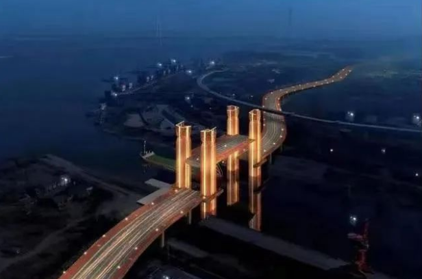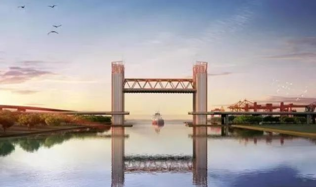 該橋?qū)儆谖錆h市青山區(qū)右岸大道(建設(shè)十一路至焦沙二路)北段工程的項(xiàng)目之一。右岸大道北段工程位于長江以南,西接青山主城區(qū),東連化工區(qū),是實(shí)現(xiàn)武鄂同城的重要連接通道。其上跨工業(yè)港運(yùn)河,由于有通航需求,以及汛期水面上漲因素,因此采用了垂直升降開啟橋的橋型。該橋主跨104米,寬度31米,2650噸重的鋼箱梁由4臺(tái)提升系統(tǒng)操作升降,每臺(tái)提升系統(tǒng)有2個(gè)卷筒,一端懸吊鋼梁,另一端懸吊平衡重。全橋8套平衡重組,分別置于兩端塔樓內(nèi)。橋面平時(shí)距離水面的通航凈空高度8米,最大可提升27米。橋面提升時(shí),就像坐電梯一樣升高。上橋位置安裝了移動(dòng)護(hù)欄,當(dāng)橋面升起后,有橋梁管理人員對(duì)車輛進(jìn)行有序管控,暫停上橋。