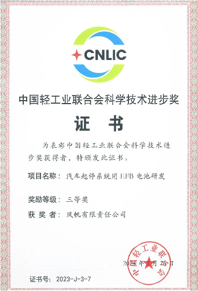 中國輕工業(yè)聯(lián)合會科學(xué)技術(shù)進步獎是中國輕工業(yè)聯(lián)合會設(shè)立的最高輕工科技獎項,屬于國家部級科技獎勵,被認為是輕工業(yè)的“榮譽勛章”。汽車起停系統(tǒng)用EFB電池項目獲得該項榮譽,是對風(fēng)帆技術(shù)研發(fā)實力的充分肯定。