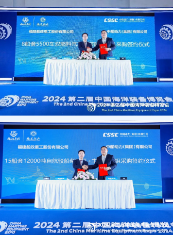 大會(huì)期間,中船動(dòng)力與福建船政重工股份有限公司簽訂8船套 5500PCTC汽車滾裝船主機(jī)采購(gòu)協(xié)議及15船套12000噸自航駁船主機(jī)+主發(fā)電機(jī)組采購(gòu)協(xié)議。其中,12000噸自航駁船主機(jī)+主發(fā)電機(jī)組共計(jì)75臺(tái)中速機(jī),創(chuàng)下了雙方合作以來(lái)單批次簽單歷史新高,進(jìn)一步加深了雙方在綠色動(dòng)力領(lǐng)域的合作。