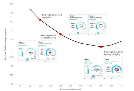 如果蓄電池能夠提供峰值負載,則不再需要啟動額外的發(fā)動機。其結(jié)果是更少或更小的發(fā)動機在更高效的負載水平上運行。PEMS將利用低負載周期對蓄電池進行充電。
