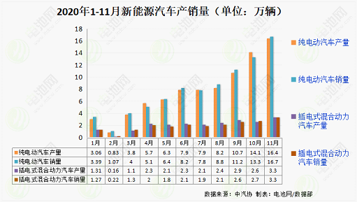 其中,11月,新能源汽車產(chǎn)銷分別完成19.8萬輛和20萬輛,同比分別增長75.1%和104.9%,其單月產(chǎn)銷第5次刷新了當月歷史記錄。其中純電動汽車產(chǎn)銷分別完成16.4萬輛和16.7萬輛,同比分別增長66.2%和100.5%;插電式混合動力汽車產(chǎn)銷均完成3.3萬輛,同比分別增長136.4%和128.9%;燃料電池汽車產(chǎn)銷分別完成288輛和290輛,同比分別增長7.2倍和28倍。