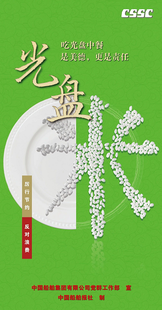 為認(rèn)真貫徹落實(shí)習(xí)近平總書記關(guān)于制止餐飲浪費(fèi)行為的重要指示精神,大力弘揚(yáng)中華民族勤儉節(jié)約、珍惜糧食的文明用餐習(xí)慣,中國船舶集團(tuán)積極開展“制止餐飲浪費(fèi) 踐行光盤行動”專項宣傳引導(dǎo)活動。
