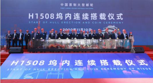 大型郵輪工程是中國船舶集團貫徹習近平總書記重要指示精神、落實國家戰(zhàn)略、滿足人民美好生活需要的重大舉措,也是中國船舶集團強化科技創(chuàng)新、促進轉型升級、推動高質量發(fā)展的一號工程。2018年11月6日,中國船舶集團與美國嘉年華集團、意大利芬坎蒂尼集團在首屆中國國際進口博覽會上正式簽訂2+4艘13.5萬總噸Vista級大型郵輪建造合同,并舉行了中國船舶集團大型郵輪項目工程正式啟動儀式。這是我國首次簽訂真正意義上的大型郵輪建造合同,開啟了中國船舶工業(yè)建造大型郵輪的新時代。2019年10月18日,中國首制大型郵輪在外高橋造船正式開工點火進行鋼板切割,全面進入實質性建造階段。一年多來,在中國船舶集團的堅強領導下,在中船郵輪科技發(fā)展有限公司、中船第九設計研究院工程有限公司、上海船舶工藝研究所等兄弟單位的大力支持下,外高橋造船經受住了新冠肺炎疫情的洗禮和考驗,克服了物資采購、薄板車間流水線建設滯后等一系列困難,一步一個腳印,如期實現了塢內連續(xù)搭載總裝的里程碑節(jié)點。