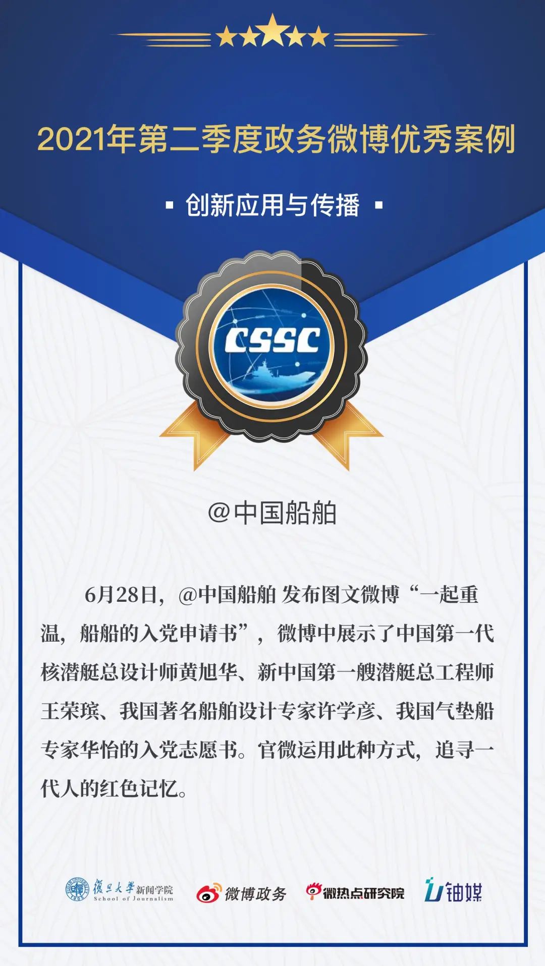 在幾百個(gè)微博政務(wù)賬號、幾千個(gè)微博政務(wù)優(yōu)秀案例的評選中,@中國船舶 憑借圖文微博“一起重溫,船船的入黨申請書”,再一次拿下“創(chuàng)新應(yīng)用與傳播”的獎(jiǎng)勵(lì),真的是太棒了!
