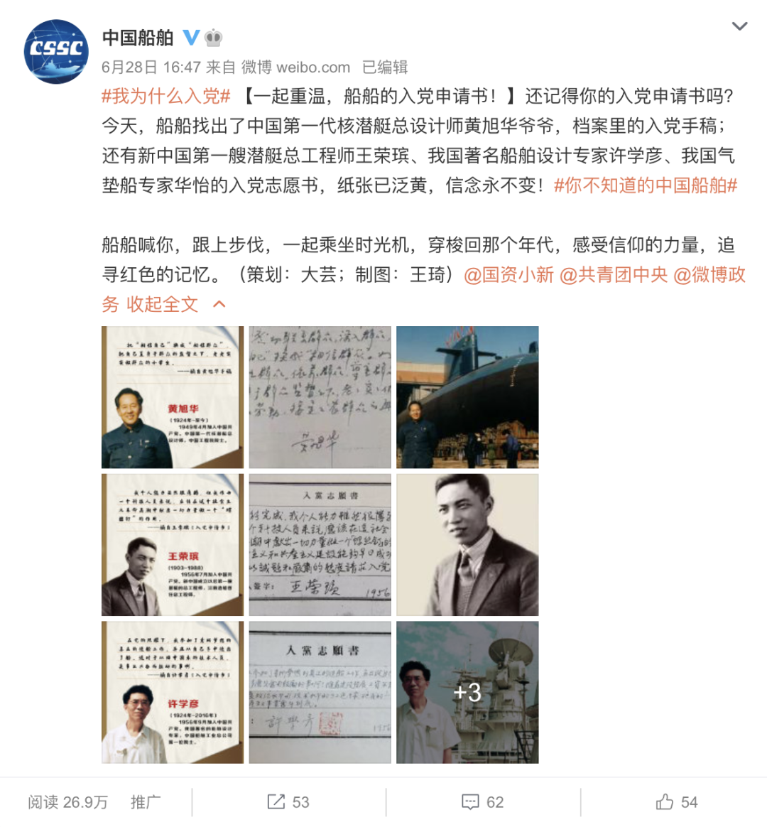 這篇微博展示了中國第一代核潛艇總設(shè)計(jì)師黃旭華、新中國第一艘潛艇總工程師王榮瑸、我國著名船舶設(shè)計(jì)專家許學(xué)彥、我國氣墊船專家華怡的親筆入黨志愿書,用一種時(shí)空穿越的方式,追尋一代人的紅色記憶,用船舶人的方式,慶祝建黨百年。