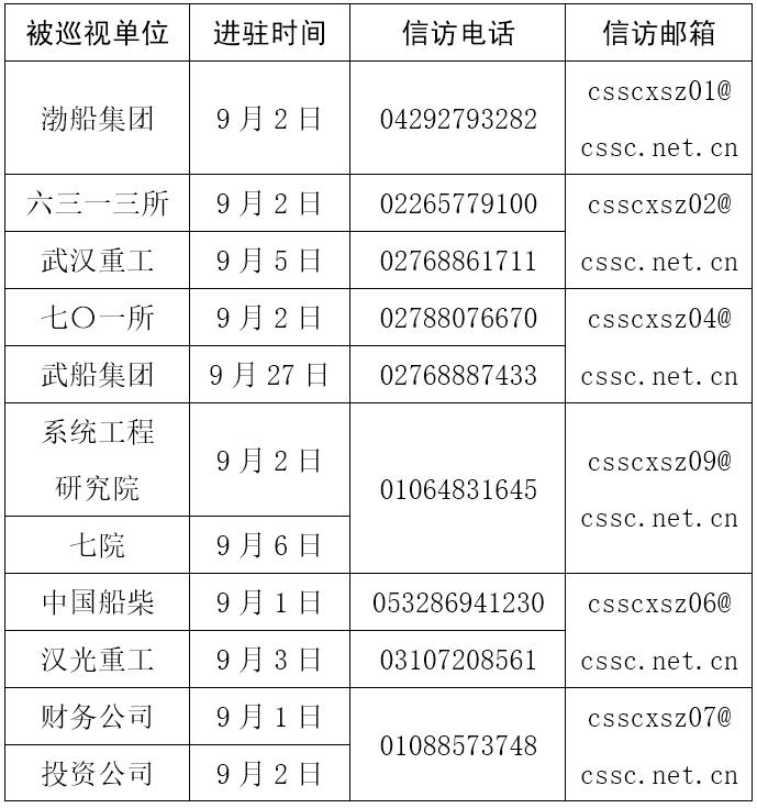 根據(jù)集團公司黨組對2021年第二輪巡視工作的統(tǒng)一部署,截至9月6日,集團公司黨組巡視組已基本完成進駐,對渤船集團等單位黨組織開展巡視,現(xiàn)場巡視約40天。 現(xiàn)場巡視期間,巡視組信訪電話如下: