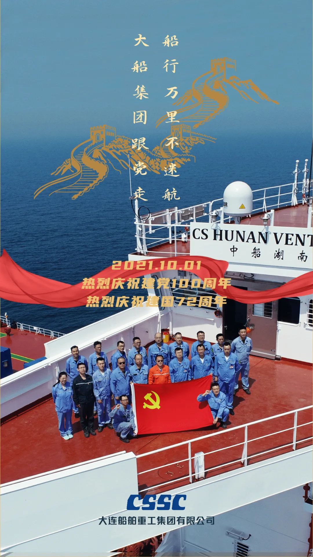 今天,我們迎來新中國72周年華誕。作為我國海軍裝備建設(shè)的主力軍,中國船舶大船集團(tuán)將不忘初心,牢記使命,堅定貫徹海洋強(qiáng)國、制造強(qiáng)國、科技強(qiáng)國國家戰(zhàn)略,聚焦主責(zé)主業(yè)、聚力興裝強(qiáng)軍,為實現(xiàn)中華民族偉大復(fù)興的中國夢而不懈奮斗。