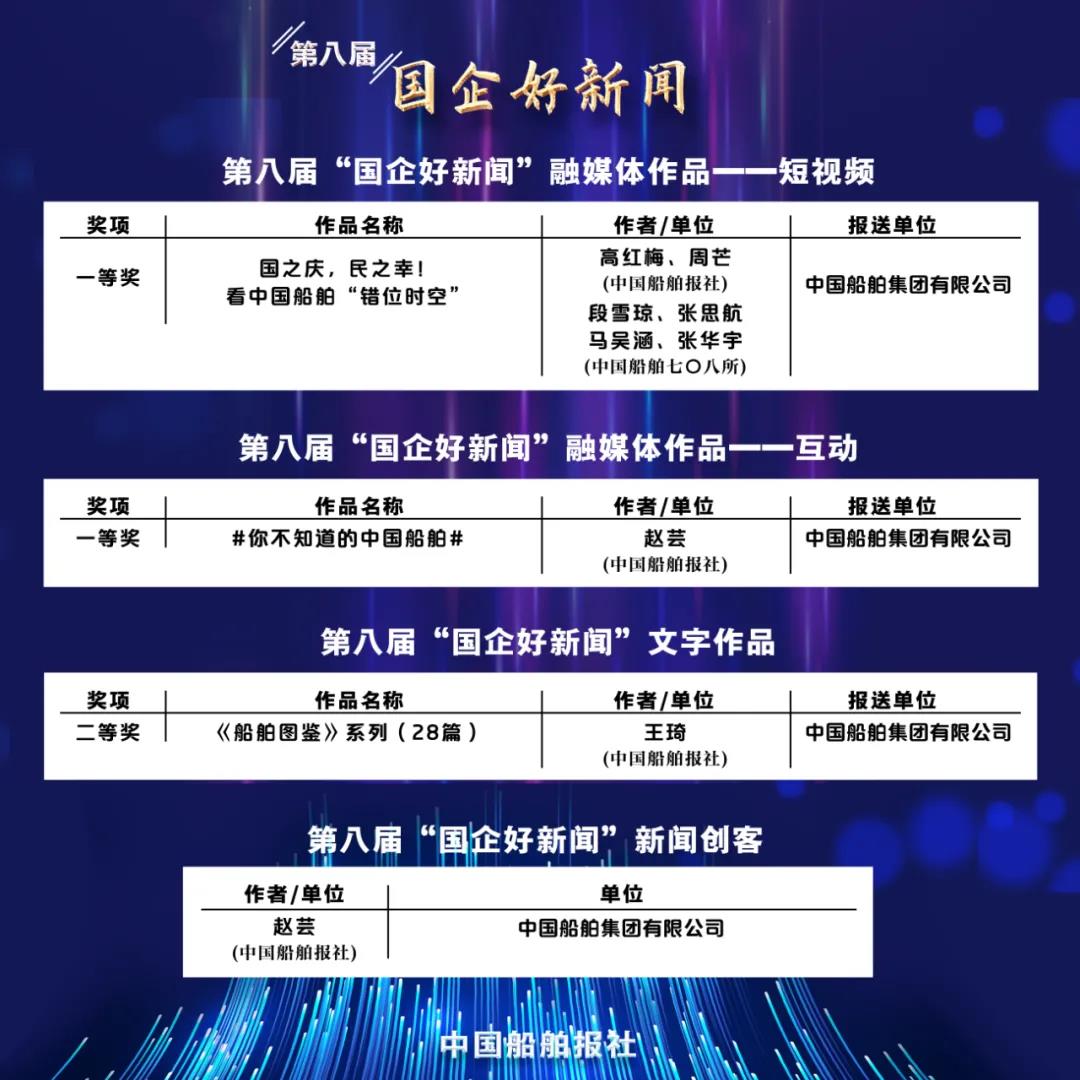 1月11日,第八屆“國(guó)企好新聞”獲獎(jiǎng)作品正式揭曉,中國(guó)船舶集團(tuán)斬獲4項(xiàng)大獎(jiǎng),涵蓋系列報(bào)道、短視頻、融媒體作品等多種體裁。其中,一等獎(jiǎng)2項(xiàng)、二等獎(jiǎng)1項(xiàng),并首次榮膺十大新聞創(chuàng)客獎(jiǎng),獲獎(jiǎng)名單如下: