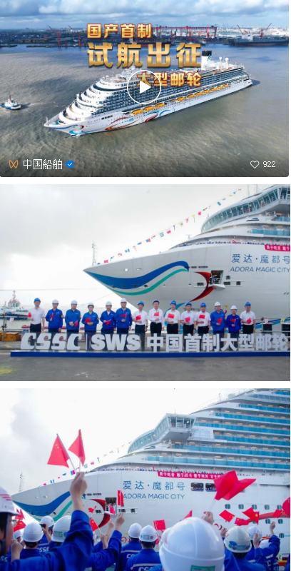 自2019年10月首艘國產(chǎn)大型郵輪開工建造以來,中國船舶集團及相關(guān)成員單位深入貫徹落實習(xí)近平總書記重要指示批示精神和黨中央決策部署,通過引進消化和自主創(chuàng)新,相繼開展了郵輪設(shè)計、建造、項目管理等專項攻關(guān),項目工程穩(wěn)步推進,各項節(jié)點順利完成,一系列科技創(chuàng)新成果落地開花。預(yù)計首制船將于今年底完工交付。