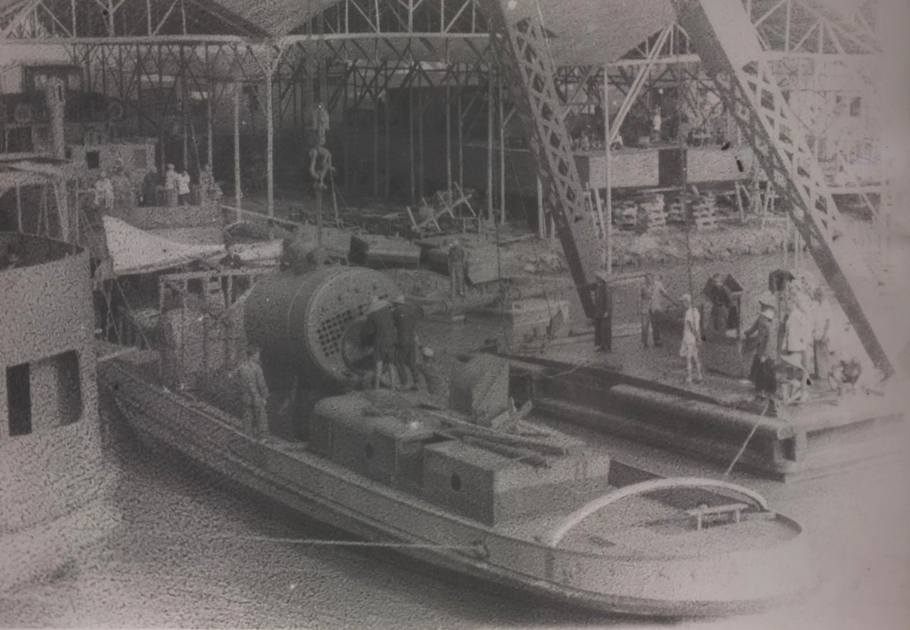 1934年武漢,上世紀(jì)30年代,武昌造船成立之初,工人們以手工作業(yè)“敲敲打打”形式開展修造船業(yè)務(wù)。修造的船只大多為100~300噸、鋼肋骨與木殼結(jié)構(gòu),僅有少量是鋼鉚接船體。建造的船只只能在長江上航行跑跑運輸。為了生存和救國,船廠還建造一些農(nóng)用機(jī)械器具、槍支,以輔助民生、支援抗日。