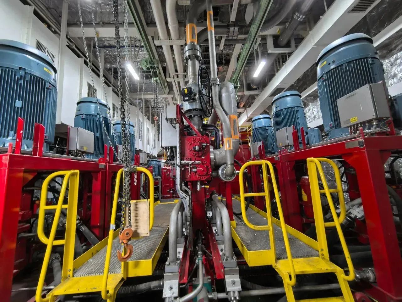 “夢(mèng)想”號(hào)鉆井系統(tǒng)提升能力強(qiáng)、反應(yīng)速度快,離不開配套的液壓提升系統(tǒng)。系統(tǒng)配有12臺(tái)泵,裝機(jī)容量達(dá)4100千瓦,高壓管路長(zhǎng)達(dá)8000多米,直徑達(dá)270多毫米,最高壓力為350公斤/平方厘米,是家庭高壓鍋耐壓的175倍。