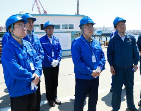 王國強(qiáng)深入船塢、碼頭、試驗(yàn)現(xiàn)場等科研生產(chǎn)一線,察看了相關(guān)產(chǎn)品、重點(diǎn)建設(shè)項(xiàng)目,與一線員工就工作、生活情況親切交流,并聽取了相關(guān)單位發(fā)展情況、科技創(chuàng)新、安全生產(chǎn)等情況匯報(bào)。