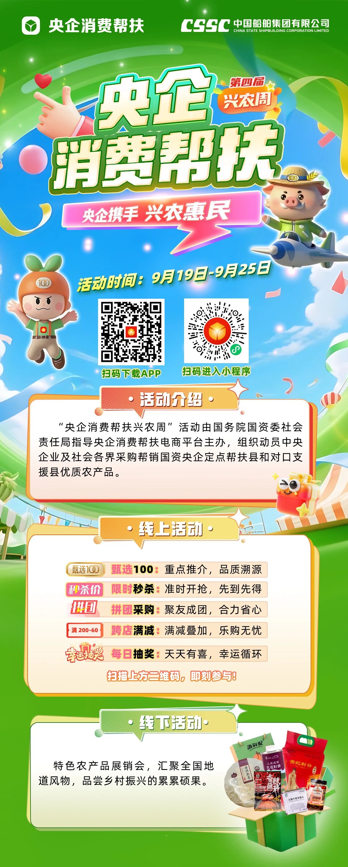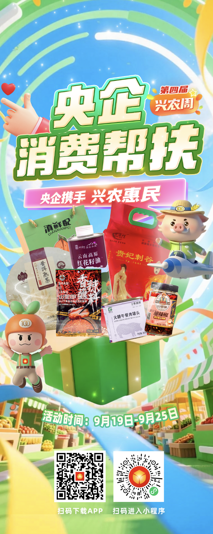 本屆“央企消費(fèi)幫扶興農(nóng)周”活動(dòng)時(shí)間為9月19日~9月25日,發(fā)布了央企消費(fèi)幫扶電商平臺(tái)助農(nóng)大數(shù)據(jù),線上開展限時(shí)秒殺、拼團(tuán)采購(gòu)、跨店滿減等促銷活動(dòng),線下舉辦特色農(nóng)產(chǎn)品展銷會(huì)、創(chuàng)辦非遺等特色主題展,再搭配包括現(xiàn)場(chǎng)簽約、展位打卡等在內(nèi)的活動(dòng),共同打造了一場(chǎng)“能看、能嘗、能買、能玩”的“興農(nóng)”盛宴。