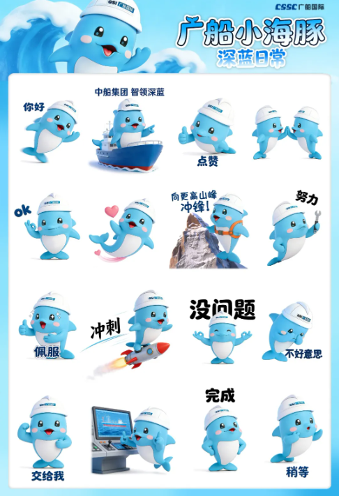 廣船小海豚?深藍日常系列表情包,以靈動可愛的小海豚為核心形象,融入廣船“深藍”底色與造船人的初心情懷,捕捉船廠工作與日常溝通的暖心瞬間。