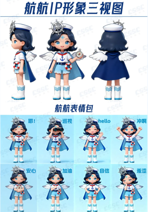 建建(造船擔當)以銀色防護頭盔(嵌船舶零件電子屏、印艦船剪影)、船錨腰帶、CSSC工裝及焊槍,凸顯造船匠心精神;航航(航行擔當)憑船舵頭飾、導(dǎo)航羅盤、海鷗披風與船錨上衣,傳遞中船航行使命。二者以 “建造 - 航行” 閉環(huán),具象中船全鏈條實力,彰顯中船文化。